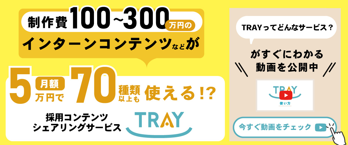 とはいえ、学生を惹きつけ続けるためには、学生の学びや満足度向上につながるようなコンテンツの用意が必要です。これからコンテンツを新しく制作したり、自社でリクルーター強化をしたりすることは、時間的にも費用的にも難しいのではないでしょうか。最後にそんな皆さんのコスト&タイムパフォーマンスを飛躍的に向上させる、定額制の採用コンテンツ提供サービス「TRAY」をご紹介いたします。きっと貴社の採用成功の一助になるはずです。