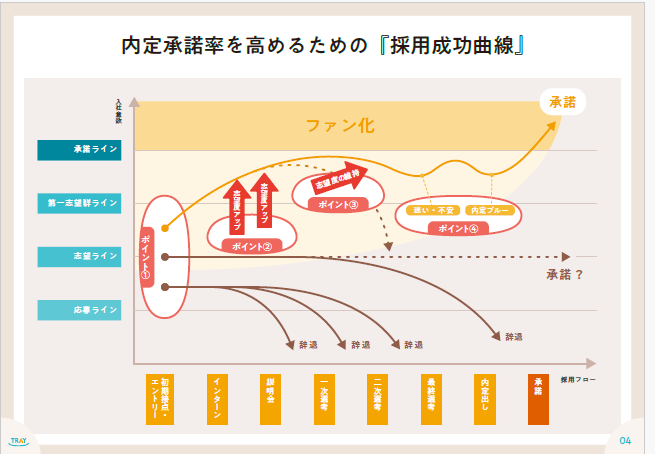 そこで対策できることとして最も重要なのは「接触した学生を内定まで惹きつけ続けること」です。費用をかけても集まらないなら、集客よりも「接客」に力をいれましょう。