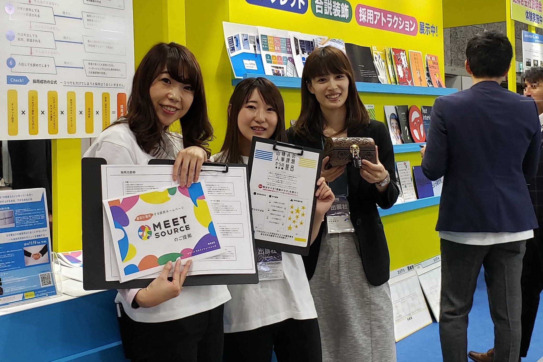 「採用成功の武器屋」という看板の明るい黄色のブースです!