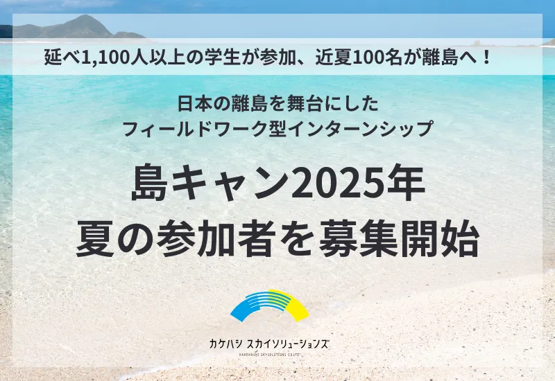 採用、育成、定着を支援する様々なソリューションをワンストップで提供する株式会社カケハシスカイ(本社:東京都新宿区、代表:中川智尚、以下:当社)は、日本の離島を舞台にしたフィールドワーク型インターンシップ「島キャン」をよりキャリア形成につなげるプログラムへとアップデートし、2025年夏の参加者を募集いたします。