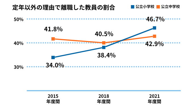 また、下記グラフのとおり、公立学校で定年以外の理由で離職した教員の割合は2015〜2021年度まで増加傾向にあります。