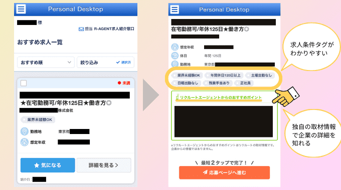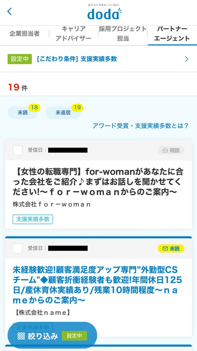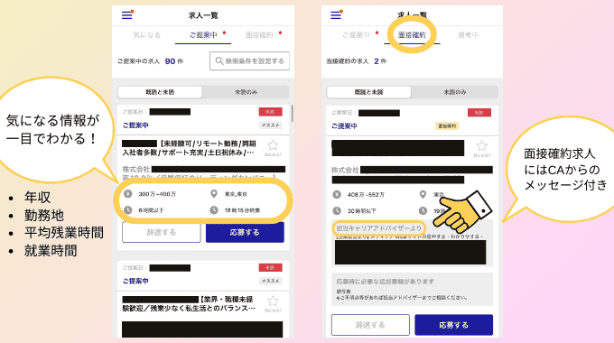 また、マイページの求人一覧には、キャリアアドバイザーからの提案求人と面接確約求人が届きます。