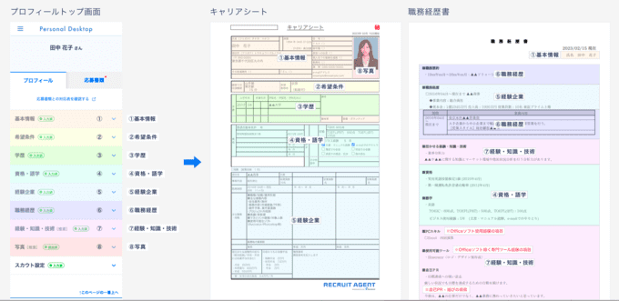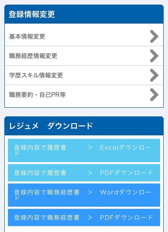 職務経歴書・履歴書の作成には職務要約、経験・スキル、学歴、資格など多くの情報が必要になりますが、マイページで段階的に記入できるので迷いませんでした。