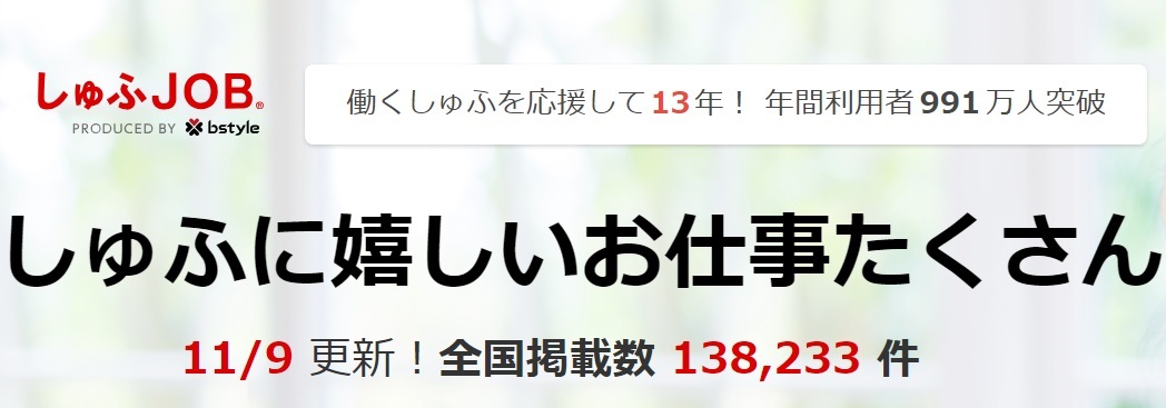 しゅふJOBは、主婦の「働きたい!」という思いを実現するための求人情報ポータルサイトです。