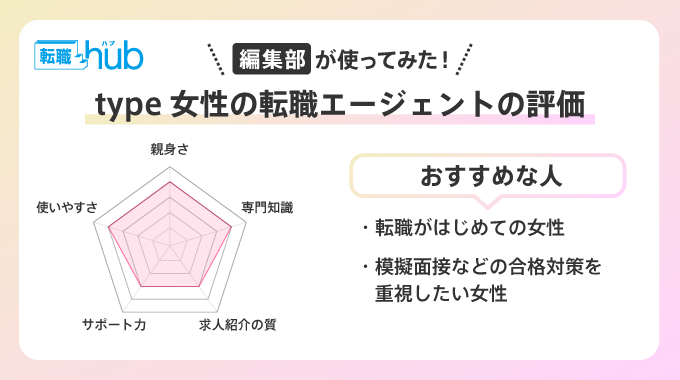 - 編集部のレビューではtype女性の転職エージェントやマイナビエージェントが高評価