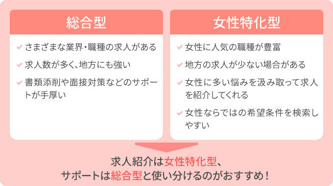 業界・職種に関わらず、多種多様な求人を扱う総合型の転職エージェントや、女性の転職支援に特化した転職エージェントなどを上手に併用することが転職活動を成功させるコツです。