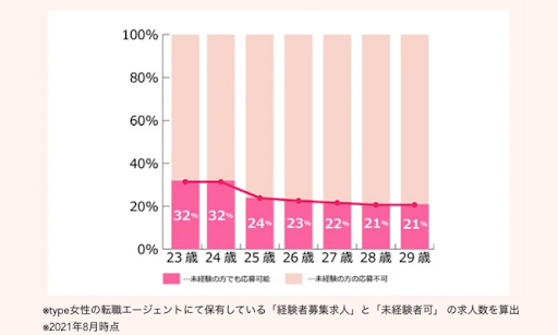 引用:type女性の転職エージェント「20代女性の転職のポイント」【年齢別】未経験求人と経験求人の割合より