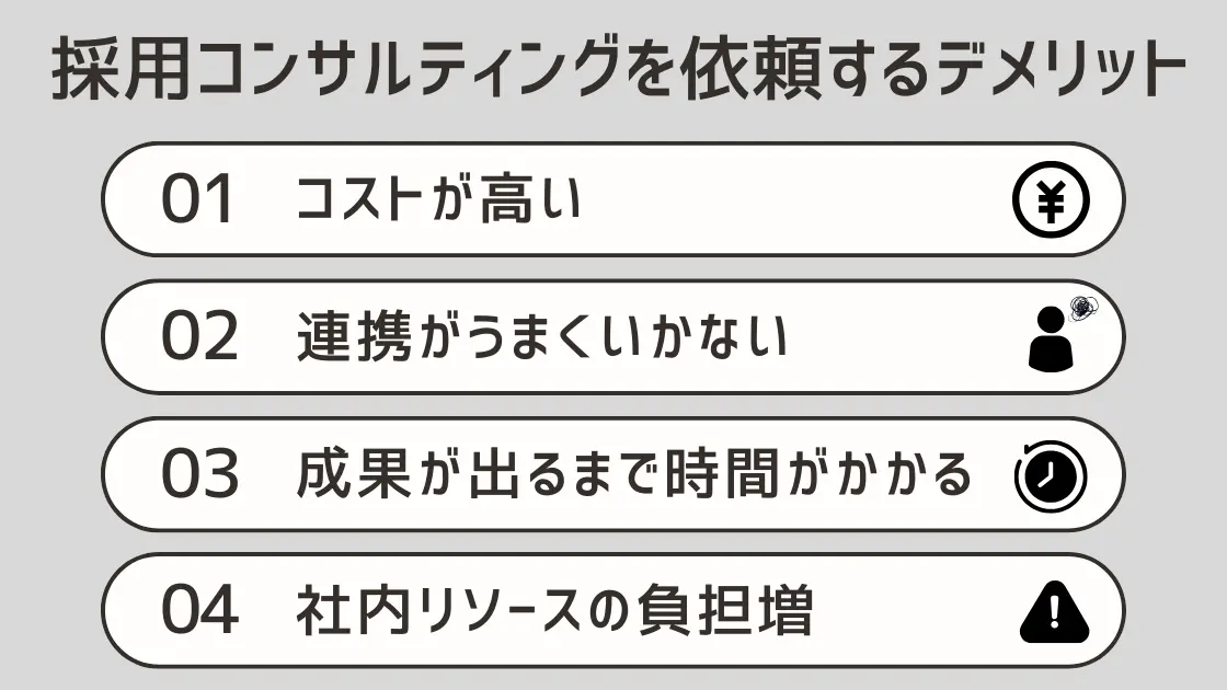 採用コンサルティングには多くのメリットがある一方で、コストやコミュニケーション面での課題もあります。ここでは、デメリットについて詳しく見ていきます。