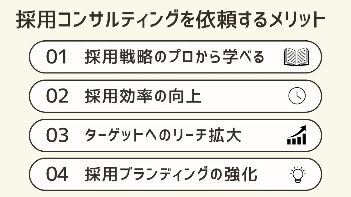 採用コンサルティングを利用することで、採用の専門知識を活用でき、採用活動全体の効率化や成果向上が期待できます。ここでは具体的なメリットについて解説します。
