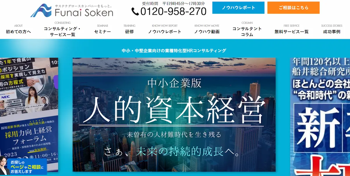 株式会社船井総合研究所は、経営全般のコンサルティングに強みを持ち、採用活動と組織改善を包括的に支援します。採用計画の立案から「3カ年計画」を基にした人事戦略の設計、さらには評価・賃金制度の見直しまで、長期的な企業成長をサポートします。