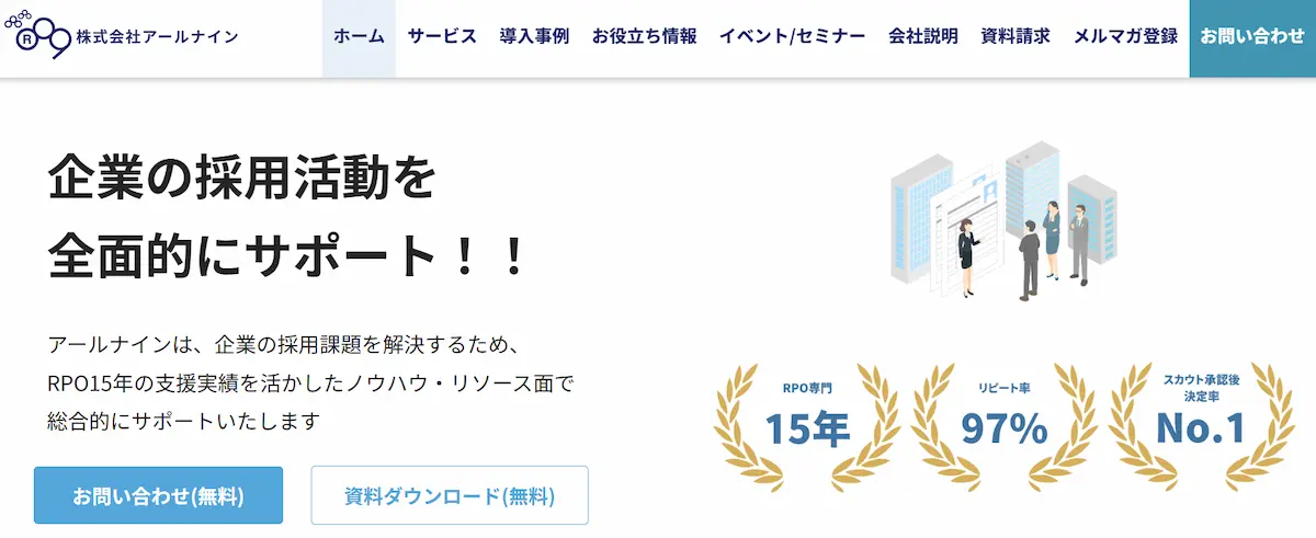 株式会社アールナインは、採用業務全般を包括的に支援するアウトソーシングサービス「人事ライト」を提供しています。戦略~実務までの請負が可能となっており、専属の採用チームが伴走することで採用に関する人事担当の負担を軽減します。