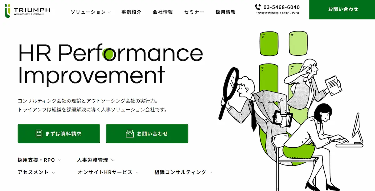 株式会社トライアンフは、採用コンサルティングのほか、人事や労務管理の分野にも精通しています。採用プロセス全体の改善を図るとともに、アウトソーシングによる業務負担軽減を実現。各社の特性に合った人材採用戦略を提案し、企業の生産性向上を目指します。