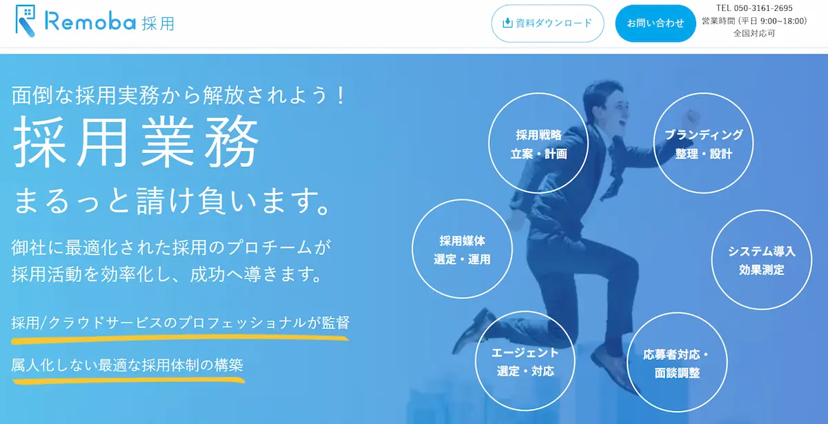 株式会社Enigolの「Remoba採用」は、面接業務以外の採用業務全般を代行するサービスです。採用戦略立案から、求人媒体運用、エージェント対応、候補者調整などを一貫してサポートします。