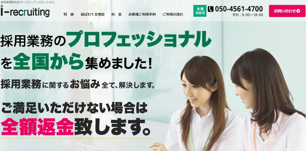 ESSTNER株式会社の採用代行サービス「i-Recruiting」は、幅広い業務に対応しており、採用業務全般の依頼が可能です。返金保証付きサービスである点にも特徴があります。