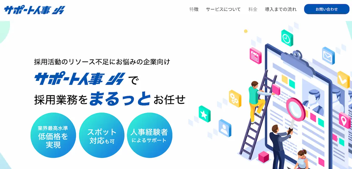 株式会社ハチロクの採用代行サービス「サポート人事」は、業界最安値の採用代行サービス。料金は月額5万円~、契約期間も1ヶ月からと必要な期間だけ依頼できる点が特徴です。