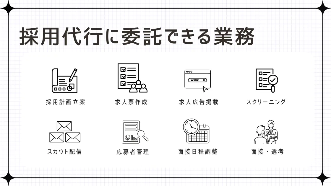 採用活動全体の効率化や採用担当の負担軽減が期待できる採用代行ですが、具体的にはどのような業務が委託できるのでしょうか?採用代行会社に委託できる主な業務内容を8つ紹介します。