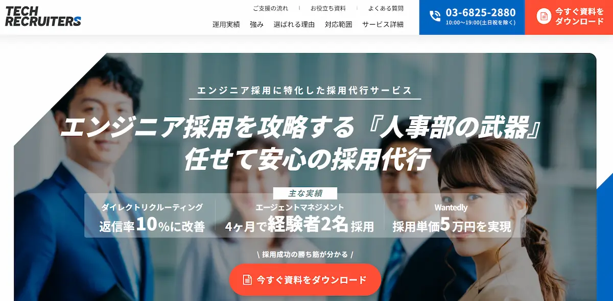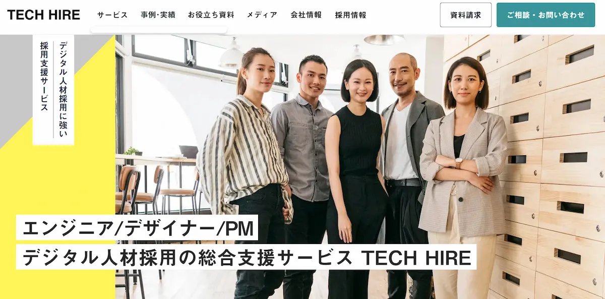 ドの採用代行サービス「TECH HIRE」は、エンジニアやデザイナー、PMなど、デジタル人材の採用に強みがあります。戦略設計から求人票の作成、スカウト配信や選考プロセスの管理、振り返りまで一気通貫で支援します。
