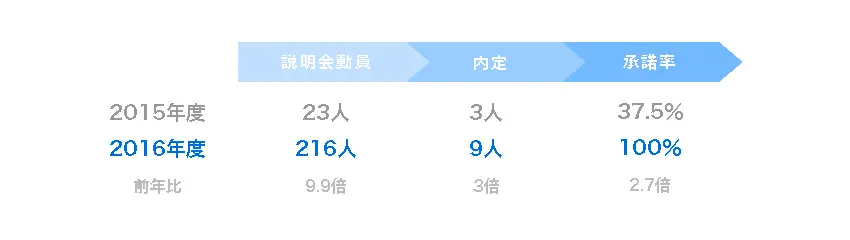 2015年度新卒採用はISフェアと合同説明会に出展しエントリーを725人確保したものの、説明会参加者はわずか23人。8名に内定を出して5名が辞退という結果に終わった。採用ターゲットは行動力・チャレンジ精神のある学生なのに、大手・安定志向の学生ばかり集まってしまっていた。2016年は100周年にあたる節目の年。新卒採用も大きく見直すことになった。