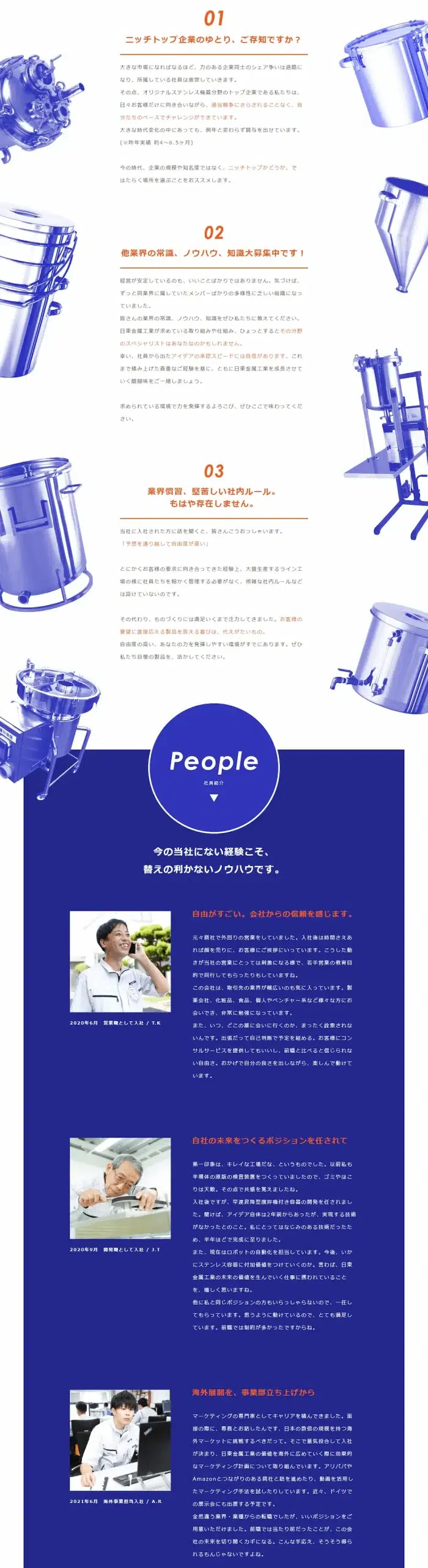 中途採用の基盤を整備すべく、中途採用に特化したLPを制作。 ステンレス容器・機器メーカーというニッチな分野でトップを走る企業でまだまだ伸び代があることや、 他業界を経験したこれまでの知見が活かせるなどのメリットを伝えた。