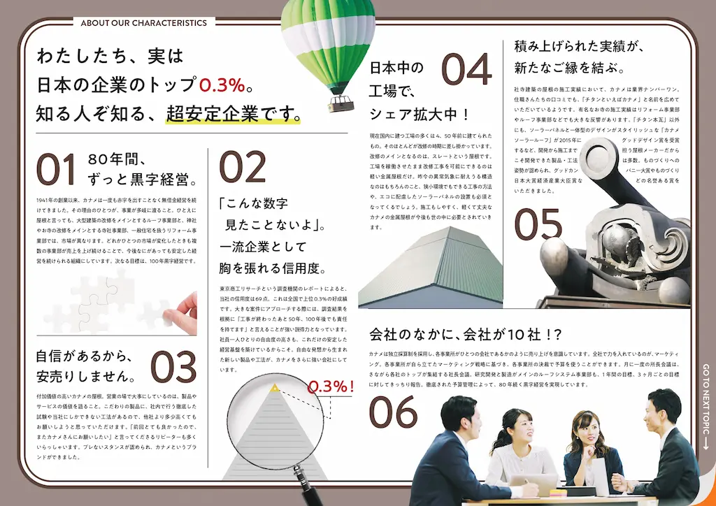 80年黒字経営が続く「安定性」と挑戦し続ける「尖り」の2面性をパンフレット上で表現。