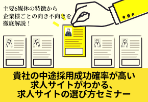 2020/03/17 Tue. 10:00-11:30 中途採用において主要媒体とされる6媒体から、自社の中途採用にぴったりな求人サイトはどこなのか、掲載する求人サイトを選ぶ上で重要な判断基準がおわかりいただけるセミナーです。