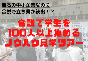 2020/03/08 Sun. 12:30~16:00の間で20~30分程度 私たちは社員約100名の学生には無名の中小企業ですが合説に出ると立ち見が続出。毎年数多くの学生と接触することができています。人が集まる会社と集まらない会社、いったい何が違うのか?実際にブースを見学いただきながら集客ノウハウを伝授いたします。