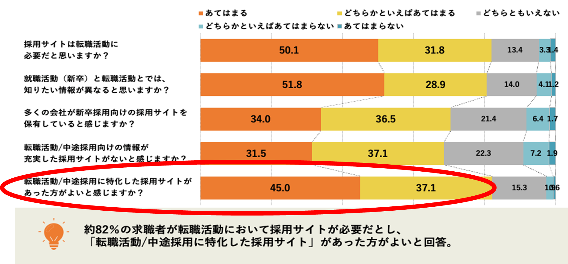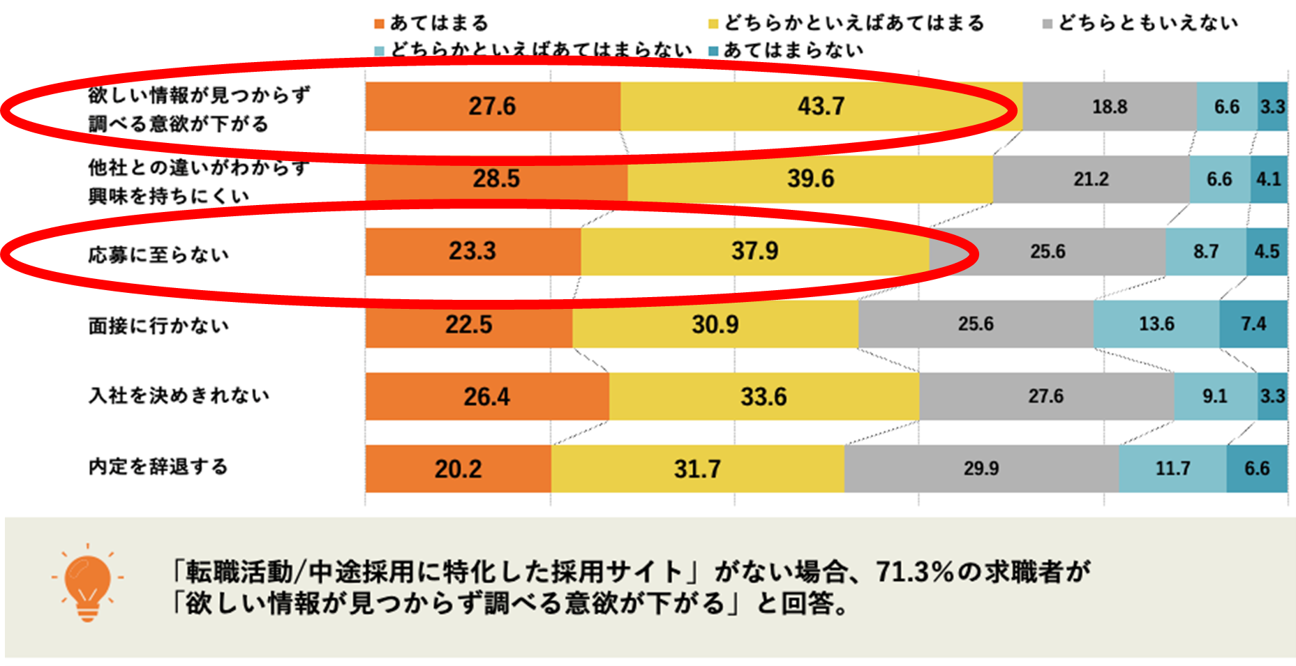 ご興味のある方はぜひお読みください。 タイトルにあるように、つい最近、弊社の「中途採用に特化した採用サイト」から応募があり、採用に成功しました。 しかも採用が難しいと言われている20代営業職です。 手前味噌ですが、どこのメディアにも出していないタイミングで、人格もよい爽やかな男性を採用することができ、コストパフォーマンスが非常によかったと思います。 ちなみに、弊社の中途採用サイトは以下からご覧いただけます。 カケハシ スカイソリューションズの中途採用サイトはこちら 採用サイトといえば、これまで新卒採用向けのサイトを制作させていただくことがほとんどでしたが、ここ最近の傾向として、「中途採用サイト」についてのお問い合わせが増えています。 中途採用の競争激化に苦戦を強いられている企業様が打開策を探されているのだと思います。 ただ、多くの企業様が疑問に思うのは、「中途採用サイトを作ったら本当に成果が出るのか?」「新卒採用サイトと中途採用サイトを分けて作る意味はあるのか?」ということでしょう。 その疑問に対する答えを得るために、一年以内に転職した約500名の方に向けて採用サイトに関するアンケート調査を実施しました。その結果の一部を抜粋してご紹介します。 Q:採用サイトについてのあなたの考えを教えてください。 ![]() このアンケートでは、80%以上の方が、「中途採用に特化した採用サイトがあった方がよい」と答えました。 では、彼らはなぜ中途採用サイトを求めているのでしょうか。その答えがわかるのが次のデータです。 Q:「転職活動/中途採用に特化した採用サイト」についてのあなたの考えを教えてください。 ![]() 中途採用サイトが「応募の決め手になる」と答えた方が80%以上もいらっしゃったのです。 このことから、中途採用サイトが応募時の情報源として重要な役割を果たしていることがわかります。 そして、中途採用サイトが採用成果につながるかどうかについては、次のデータで示唆されています。 Q:「転職活動/中途採用に特化した採用サイト」がないことで、転職活動のアクションにどのような影響があると思いますか? ?以下それぞれについてどの程度あてはまるか、お答えください。 ![]() 70%以上の方は中途採用サイトがないことで、「その企業について調べる意欲が下がる」と回答し、60%以上の方が「応募に至らない」と回答しているのです。 これは我々にとっても、驚きの回答結果でした。 転職者は、少なくとも一社以上の会社を経験していることから、事前に仕入れる採用情報に対して、より慎重になる傾向はありそうです。 また、転職者と大学生では、企業に求めるものも違えば、欲しい情報も大きく異なります。こちらの「求められる情報の違い」については、「採用サイトに関する意識調査」の資料をダウンロードいただくと、他設問への回答も含めてご覧いただけます。 「採用サイトに関する意識調査」のダウンロードはこちら あくまでも選択式で回答するアンケートですから、実際の行動結果としてはここまで極端にはならないのかもしれません。 ですが、少なくとも中途採用サイトを運用していることで、採用成果にプラスの影響がありそうだという帰結にはなっていると思います。 というわけで、最後は胸を張って、おすすめさせていただきます。 中途採用で成果を出したい、特に応募数を増やしたい、そして中途採用に特化したサイトを持っていないという企業様はぜひ中途採用サイトを作ってみてはいかがでしょうか。 様々な中途採用メディアのオプションを使いこなしたり、原稿を作り替えたりして、少しずつ歩留まりを改善するのも手ですが、「あるものをこねくり回して改善する」より「ないものを作る」方が、伸びしろが大きいと思いませんか? 弊社は中途採用サイトを作ったおかげで、通年で応募が入ってくるようになり、実際の採用につなげることができています。 安価でスピーディ、そして簡単に更新できる中途採用サイトを作成できるサービス「TRACE(トレース)」もリリースしていますので、ぜひお気軽にお問い合わせください。今回ご紹介した弊社の中途採用サイトもTRACEで制作しています。 多くの会社が中途採用に特化した採用サイトを持っていない「今」こそ、他社との差別化のチャンスです。ぜひこの機会に活用されてみてはいかがでしょうか。 ![]() Pick up Seminar Articles |