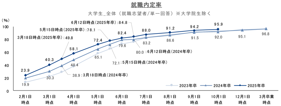 すでに一定数の企業が2027年卒の採用活動をスタートさせています。大々的な募集開始は2025年の4月からとなりますが、今はそのための準備に着手をしているのです。 内定率が大学3年生の2月1日時点で23.9%(前年4ポイントUP)、進路決定率が14.1%(前年2ポイントUP)と、年々早期化が進む傾向に合わせて、27卒採用においても万全の状態で4月から母集団形成をスタートさせようとする動きが活発になっています。 さらに言えば、4月は競争が激化するだろうからと、さらに前倒しをして1月や2月での本格採用に照準をあてて準備をしている企業も存在します。 もちろん、大手だけの話ではなく、中小、ベンチャー企業にもある動きです。 「まだ時間はある」と悠長に構えていると、他社が先行して学生にリーチし、魅力付けが完了してしまいます。この瞬間こそが、勝負を左右する局面だと捉えてください。 ![]() (参考:就職みらい研究所『就職プロセス調査(2025年卒)「2024年10月1日時点 内定状況」』) この苦境を乗り越えるために必要な「差別化」