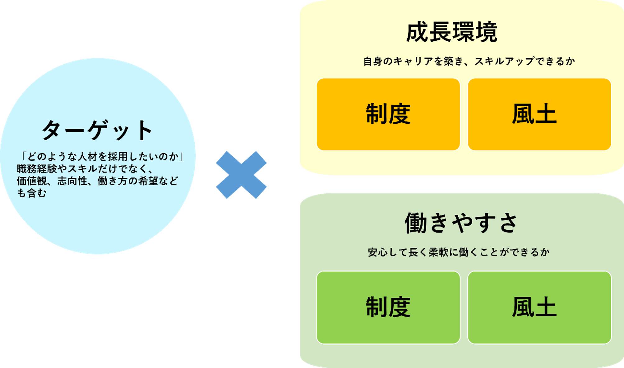 ![]() 参考:生産年齢人口と労働力人口(中小企業庁) 少なくともここから数十年間は、今よりも人材採用が簡単になることはありません。 将来から見ると「今年が最も採用が簡単な年」だと言えるほど、過酷な未来が待っています。 自社が求める人材を採用することができなければ、企業は発展成長することはおろか、加齢や退職を鑑みると現状維持すら叶いません。 企業が勝ち残れるかどうかは、人材採用ができるかどうかに懸かっていると言っても過言ではないのです。 これからの時代、求職者から「選ばれる会社」と「選ばれない会社」の差は、一層顕著になります。 当然ですが、求職者は無数の企業の中から自分に最適な場所を選ぼうと就職・転職活動をします。 SNSや口コミサイトの隆盛、さらには各種生成AIの浸透で、求職者は「本当のところどんな企業なんだろう」と簡単にリサーチすることが可能となりました。 これまでのように、求人広告の予算を増やしたり、数十社もの人材紹介業者を活用したり、広告表現で工夫をするだけでは、採用人数を確保することは難しく、採用を成功に導くには「企業の実態」を育むことが不可欠になりました。 人材採用の成否を左右する「企業の実態」とは 仕事内容、事業内容、勤務地、待遇など、これまでも重視されてきたハード面だけでなく、「働きやすさ」と「成長」が得られそうだと求職者がイメージできる「制度」と「風土」を作る必要があります。 逆に言うと、変えにくく、差別化がしにくいハード面ではなく、取り組み次第で、中小企業でも活路を見出せると私たちは考えます。 ![]() 参考:【2025年卒 選考直前調査】(株式会社ワンキャリア) ![]() 参考:20代社員の就業意識変化に着目した分析(株式会社パーソル総合研究所)? 人によって得たいもの、叶えたいことは異なりますから、すべての求職者にとって理想的な「制度」と「風土」は存在しません。 まずは、「どんな人にとって魅力的な制度と風土を作るのか」、ターゲットを定める必要があります。 現在、活躍してくれている社員と、これからの採用ターゲットが求めるものを冷静に考察して、組織の形や働き方も変えていく必要があるかもしれません。 つまり、人材を採用しやすいカタチへと、企業のカタチを変化させていくことが求められるのです。 重たい取り組みです。しかし、手遅れになると採用ができないだけでなく、離職が止まらない状況に追い込まれ、淘汰される未来が待っている可能性が非常に高いのです。 ![]() 企業の在り方を見つめ直し、次代に向けて作り直す取り組みになることから、私たちはこの取り組みを「企業のリブランディング」と定義しています。 成長戦略を描く企業様から、このリブランディングに関するお問い合わせをいただくことが増えてきました。 リブランディングに興味がある経営者様がいらっしゃいましたら、貴社の採用ブランド力を診断させていただきますので、お問い合わせください。 対応できる企業数に限りがありますので、ご了承いただけますと幸いです。