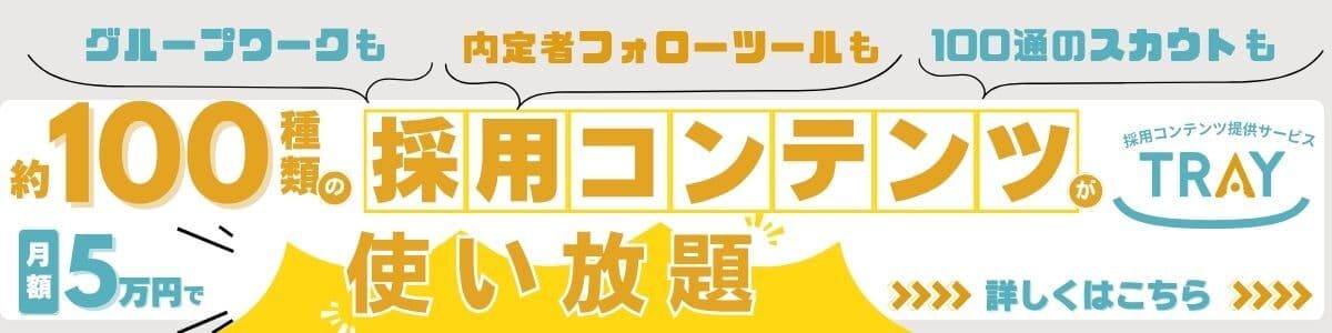 ・採用サイトのリニューアル--------------------- ・夏のインターンシップの企画 ・秋冬のインターンシップ(仕事体験)の企画 ・オープンカンパニーの企画 ・リクルーター研修の企画 ・ダイレクトリクルーティングでスカウトメールを200通配信 ・内定者フォローイベントの企画 ・内定者フォロー用コミュニケーションツールの利用 ・内定式の企画 --------------------- 選択肢 A:2,000万円 B:1,000万円 C:500万円 D:300万円 今の新卒採用市場はなかなかの買い手市場です。 ここを乗り越えるためには上記のような「あの手この手」を尽くす必要があります。 さて、先ほどの質問の答えとしてあなたはどれを選びましたか? もちろんかかるコストは、提供されるコンテンツやサービスの品質やボリュームにもよりますが、場合によっては2,000万円かかってもおかしくない外注ボリュームです。 ここから予算と工数のバランスを見て、どれを外注し、どれを内製しようか、と考えていくのが採用予算を任された責任者としての仕事でしょう。 でも、ちょっと待ってください。 これらすべてを60万円でおこなう手段があれば、いかがでしょう? 今日は少しだけその宣伝させてください。 弊社が運用しているTRAYという採用コンテンツのサブスクサービスを1年間上手に使えば… ・インターンシップで使える仕事体験ワークやチームビルディングワーク ・オープンカンパニーで使える自社理解ワークや自己分析ワーク ・リクルーター研修で使えるプレゼントレーニング、面接研修トレーニングのワーク ・内定者フォローで使える採用の振り返りワーク、企業理解促進ワーク、交流ワーク など約100種類のコンテンツが使い放題、組み合わせ放題となります。 さらに追加費用を一切かけることなく、 ・スカウトメール100通の配信代行 ・内定者フォローツール1年間無料利用 ・採用サイトの無料制作と1年間の無料運用 をすべて使えるようになります。 もう一度言いますが、これら全部を使っても1年間で60万円です。 ここまで読んでいただいて、若干うさんくさいと思われているのはコラムを書きながら想像がつきます。しかし、全く嘘偽りは書いていないのです。 もちろん「自社に合わせてオリジナルのコンテンツを作ってほしい」となれば追加費用が発生します。 ただし、TRAYの中の仕事体験ワークをカスタマイズすれば、一から作る20%程度の費用で作れます。 あるいは、使い放題のコンテンツを組み合わせることで、実質オリジナルのワークを運営するという手段もあります。その場合はもちろん追加費用ゼロです。 TRAYというサービスが描く未来は、採用予算と工数のせめぎ合いの中で、優先順位を明確にし、可能なところは削減し、コア業務に採用担当者の時間と工数と予算をかけられる世の中です。 いくらAI化が進もうが、採用活動で相手にするのは「人生について真剣に考える求職者」です。 そんな人に会社を語り、ビジョンを語り、愛を伝えるのは、採用担当の皆さんでしかできない仕事であるはずです。ぜひそこに集中してください。 そしてあなたではなくてもできる仕事はTRAYにおまかせください。 ![]() Pick up Seminar Articles |