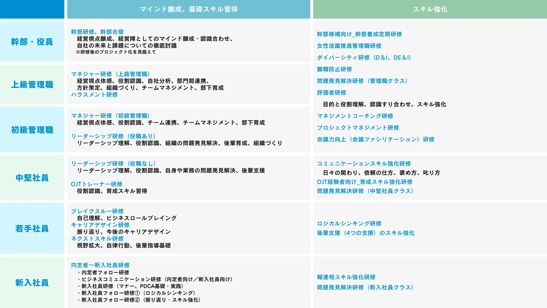 必要に応じてフォローアップ研修や、定期的なスキルチェックを行うプランも可能です。 - 対象となる受講者はどのような階層ですか?