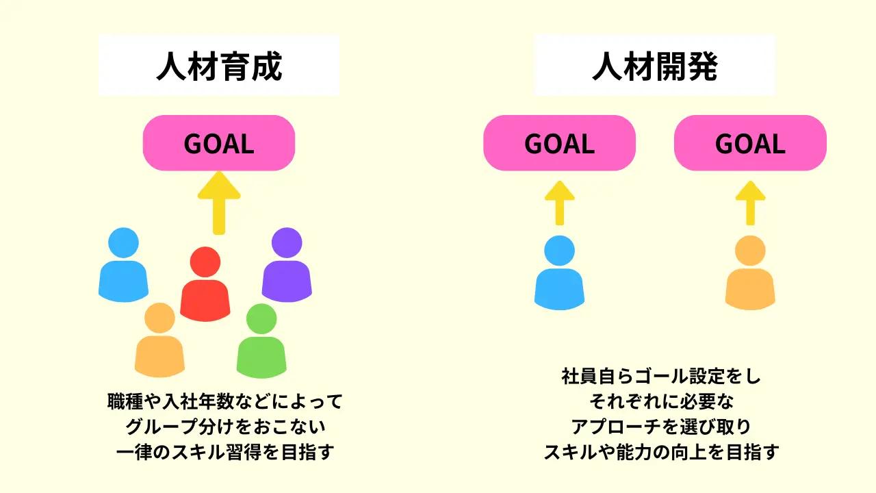 人材育成は職種や役職・入社年数などで対象者を分けてグループ別に研修をおこなう一方で、人材開発では従業員ごとにそれぞれ個別に目標を設定して研修をおこなうのが一般的です。
