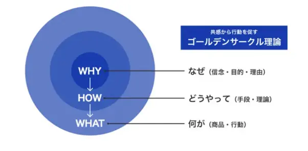 ゴールデンサークル理論とは、「Why(なぜ)」→「How(どうやって)→「What(何が)」の順で伝えることで共感を得られ、行動を促しやすくなるという理論です。