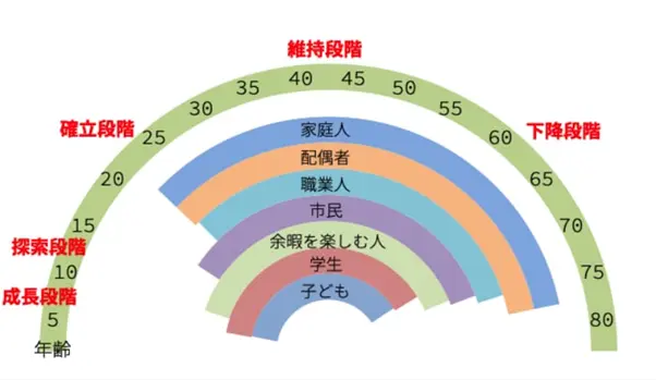 ライフキャリアレインボーとは、仕事だけでなく、プライベートにおける役割の部分(ライフキャリア)も含め、虹色のように相互関係を保ちつつ、キャリアが形成されるという考え方です。
