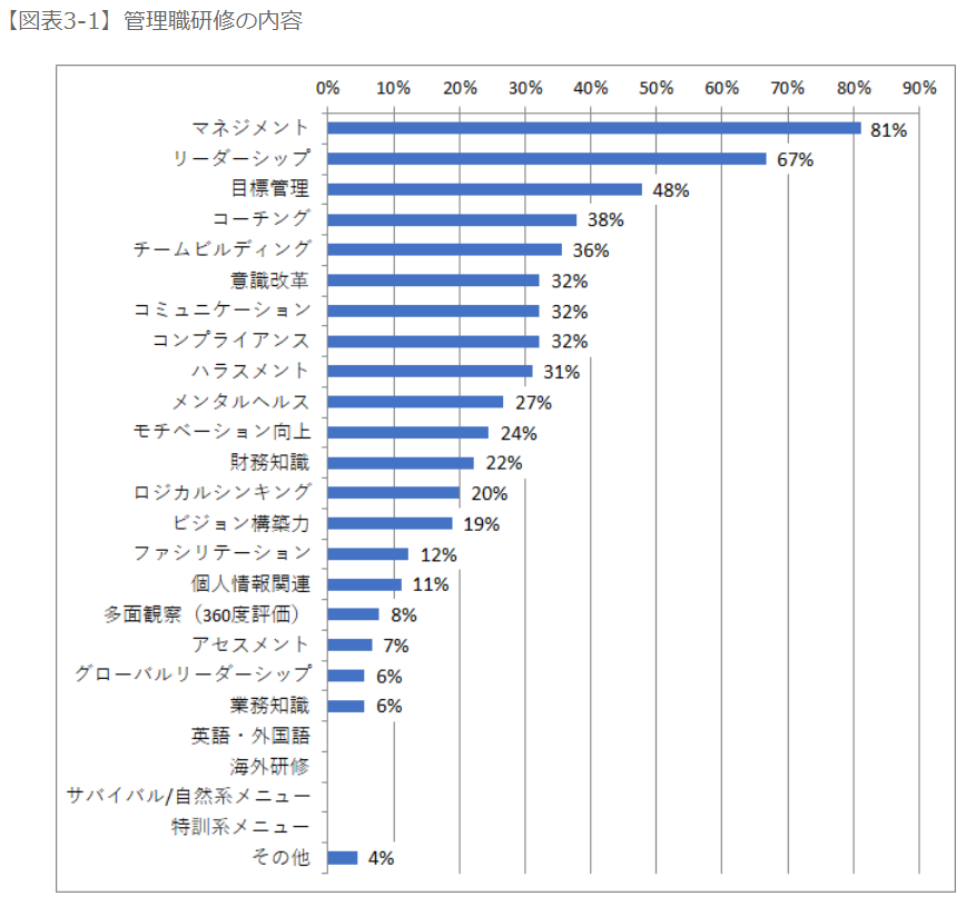 また、管理職研修の内容を見ると「マネジメント」が81%と最も高く、次いで「リーダーシップ」が67%「目標管理」が48%「コーチング」38%といった結果でした。