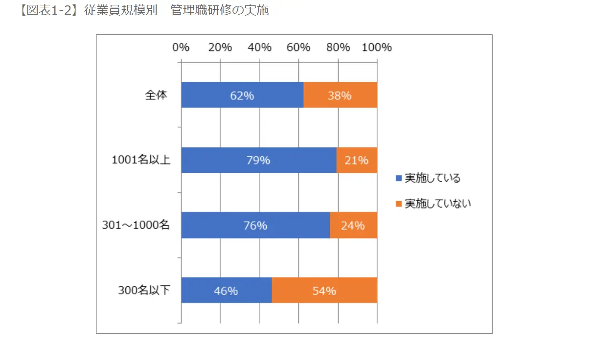 しかし、300名以下の中小企業になると46%と半数以下で一気に下がり、規模が小さくなるほど管理職の育成が浸透していない印象です。
