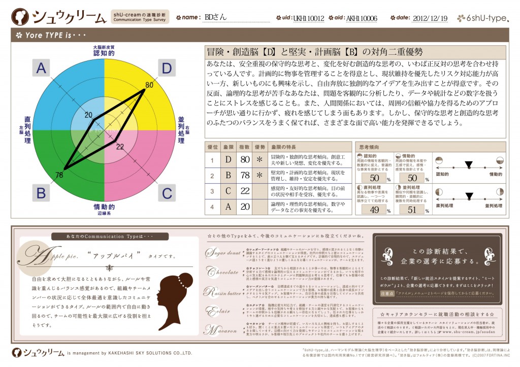シュウクリームの適職診断「6shU-type」は、フォルティナ株式会社http://www.fortina.co.jp/)が提供する「効き脳診断」により分析しています。「効き脳診断」はハーマンモデル理論による有償診断で国内利用実績No.1を誇るサーベイで、女子学生の就活と社会人生活を応援する『シュウクリーム』の活動に賛同いただき、有効なアドバイスツールとして「効き脳診断」の導入にご協力いただきました。
