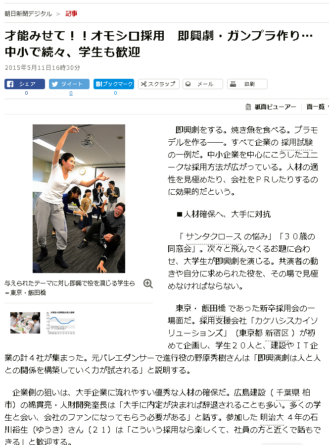 「即興演劇採用」を、2015年5月11日(月)の朝日新聞にてご紹介いただきました。