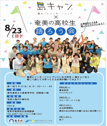 島おこしインターンシップ「島キャン」を企画・運営するカケハシスカイは、鹿児島県奄美市主催の「島キャン生×奄美大島の高校生語ろう会」を共催し、奄美大島の高校生と都会の大学生との交流イベントを8月23日(日)に鹿児島県立大島高等学校にて開催いたします。