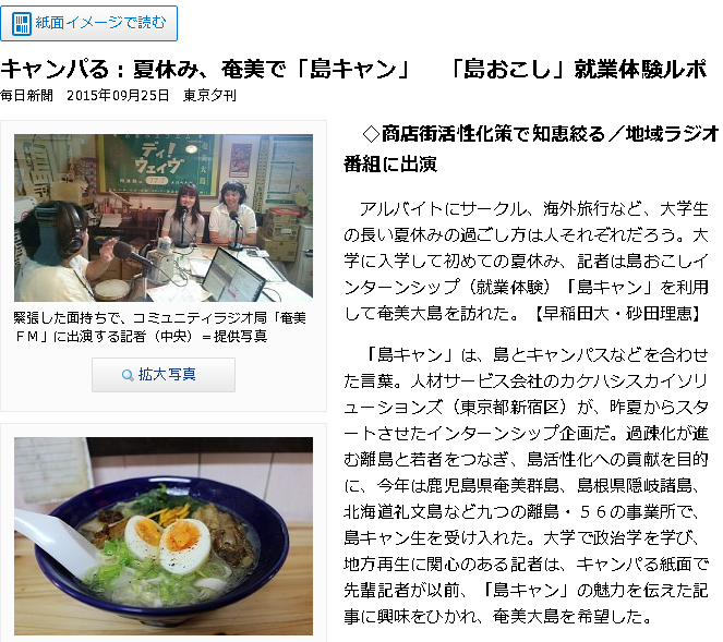 毎週金曜日の夕刊のコーナー「キャンパる」の中で、奄美大島の過疎化の現状や、島の方の地域活性の取り組みなどを自身の体験談と共に紹介くださいました。