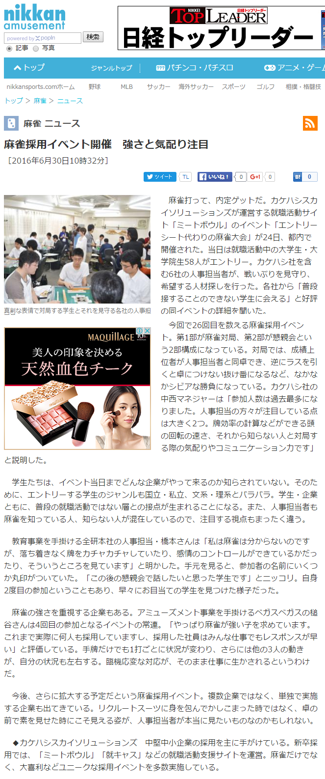カケハシスカイの企画運営WEBサイト『ミートボウル』主催の2017年卒・就活イベント「麻雀採用」を取材いただいた記事を、2016年6月30日(木)に「日刊スポーツ」で紹介いただきました。