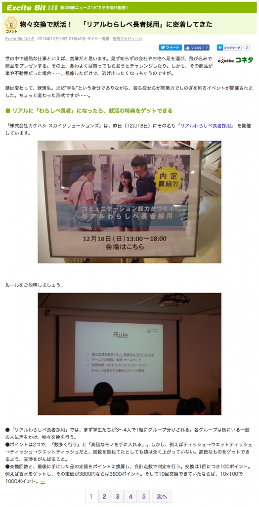 20161220excite%e3%80%8c%e3%83%aa%e3%82%a2%e3%83%ab%e3%82%8f%e3%82%89%e3%81%97%e3%81%b8%e3%82%99%e9%95%b7%e8%80%85%e6%8e%a1%e7%94%a8%e3%80%8d1▼物々交換で就活!「リアルわらしべ長者採用」に密着してきた