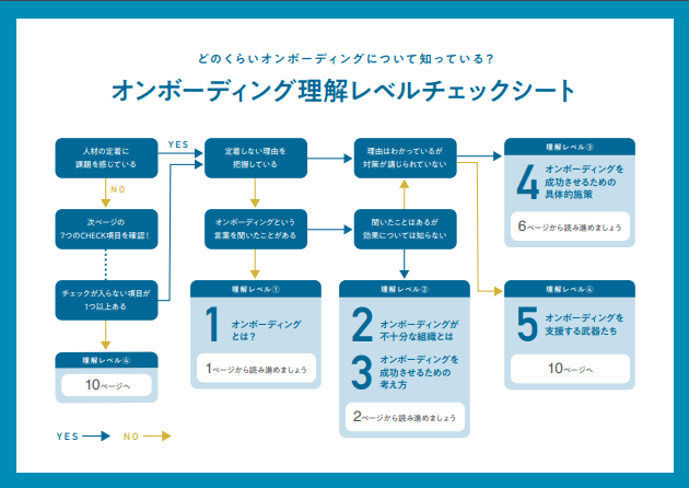 冒頭には「オンボーディング理解レベルチェックシート」をご用意。簡単な質問にYES/NOで答えることによって現在のオンボーディングへの理解レベルがわかり、読むべきページやこれからおこなうべき施策が見えてきます。