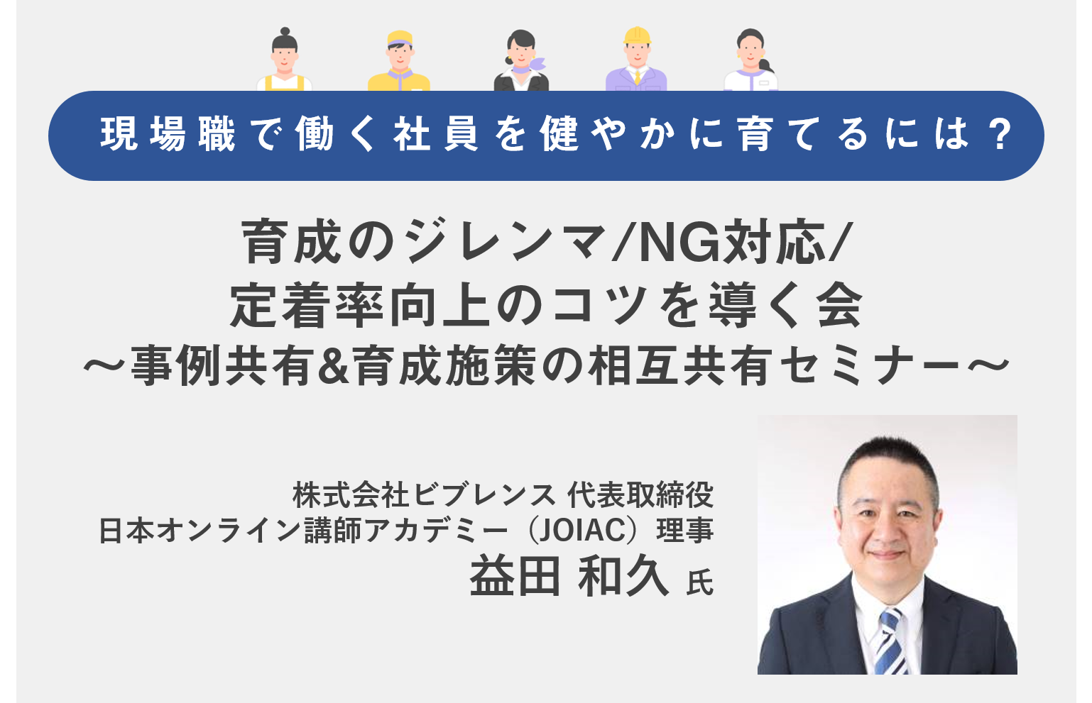 今回はそんなお悩みについて大手企業の現場職で働く社員への講師経験を多数お持ちであり、日本オンライン講師アカデミー(JOIAC)の理事としてもご活躍の益田和久氏より、実際にあった事例をもとに現場スタッフの関わりポイントやNG対応、現場実践に落とし込む仕組みなど、育成のポイントを解説いただきます。