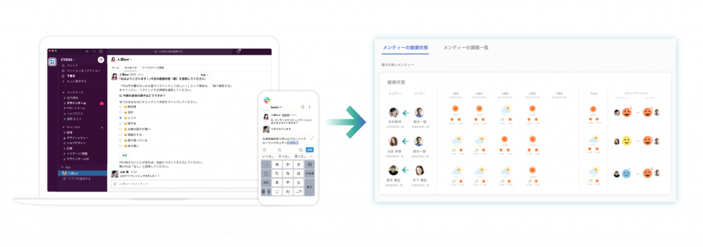 2.実際の職場では育成支援システムmentor(メンター機能)を利用。Slackのチャットbotを活用し、日報機能で日々の学びをトレーニー自身が振り返ったり、トレーニーが困っていることを課題管理機能で把握したり、学びや課題の管理をおこなうことができます。目標管理機能では、一人ひとりが目標設定をすることも可能です。