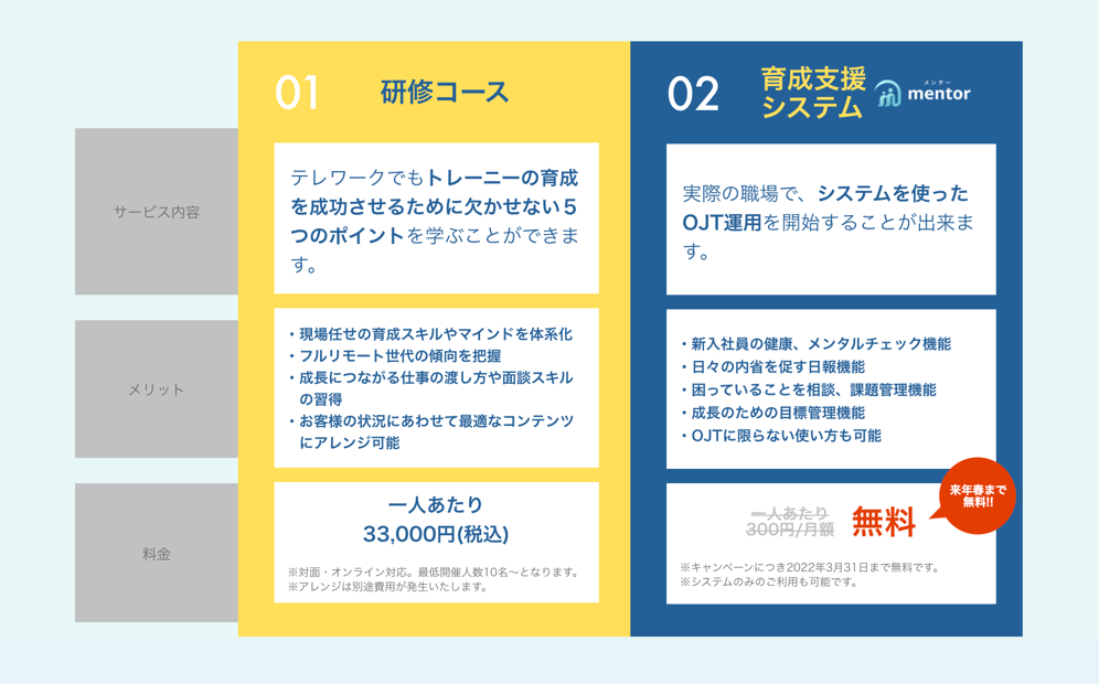 本来、「OJT Builder」は、システムと研修の費用を合わせた金額でご案内しておりますが、2022331日まで、メンター支援システムmentorは無料、研修分のみの費用でご提供いたします。