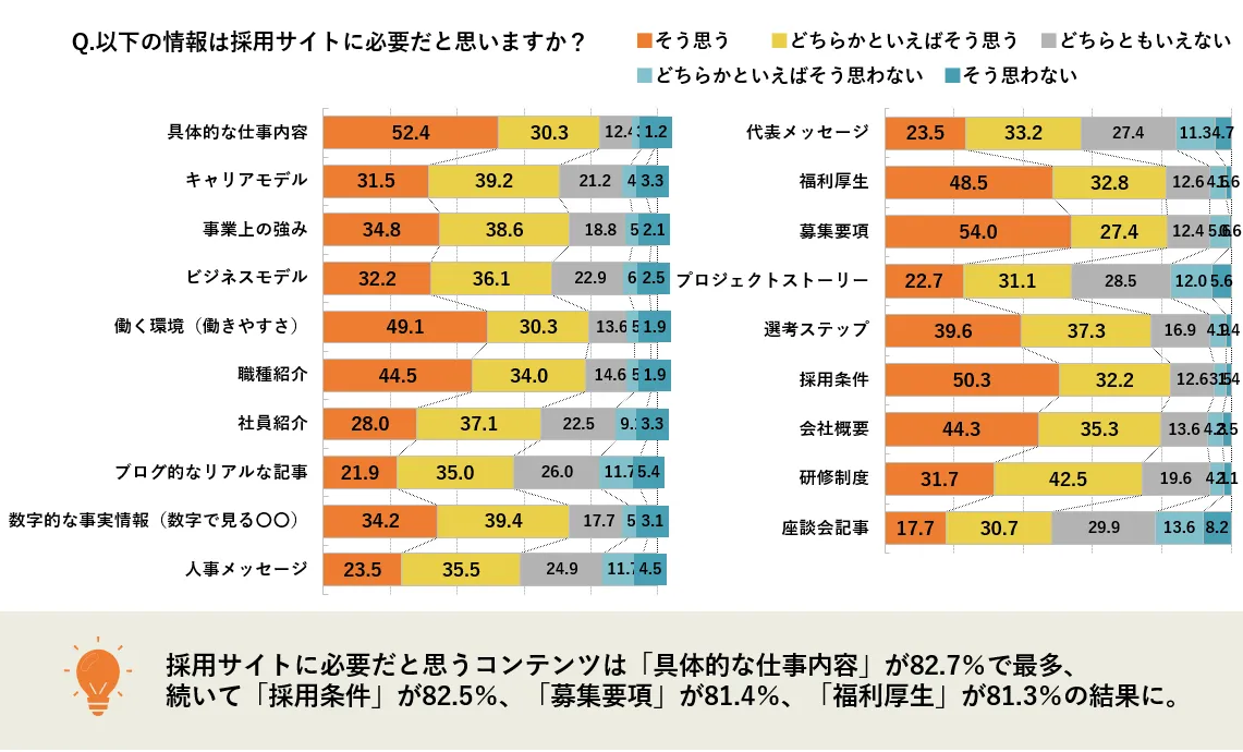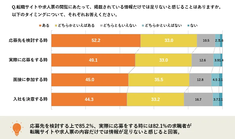 特に「応募先を検討する」タイミングでは、85.2%が転職サイトや求人票の情報だけでは不足していると回答しました。