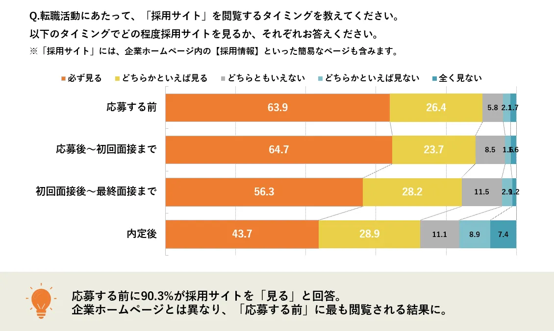 90.3%の求職者が応募前に企業側の採用サイトを閲覧しており、特に応募前の段階での閲覧が最多となりました。
