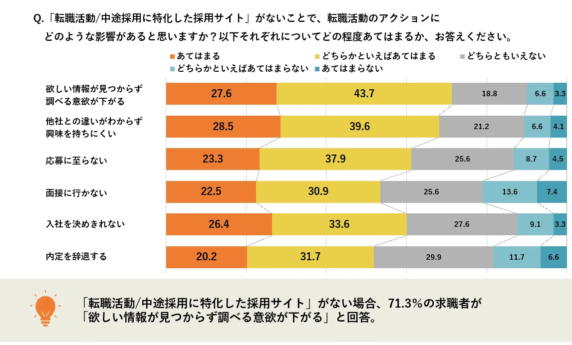 転職活動/中途採用に特化した採用サイトがない場合、転職者の71.3%が「欲しい情報が見つからず意欲が下がる」、