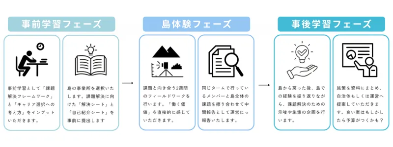 現地体験だけでなく、離島の現状を学ぶ「事前学習」と今後の関わり方や自身のキャリアを考える「事後学習」を新たにご用意しました。